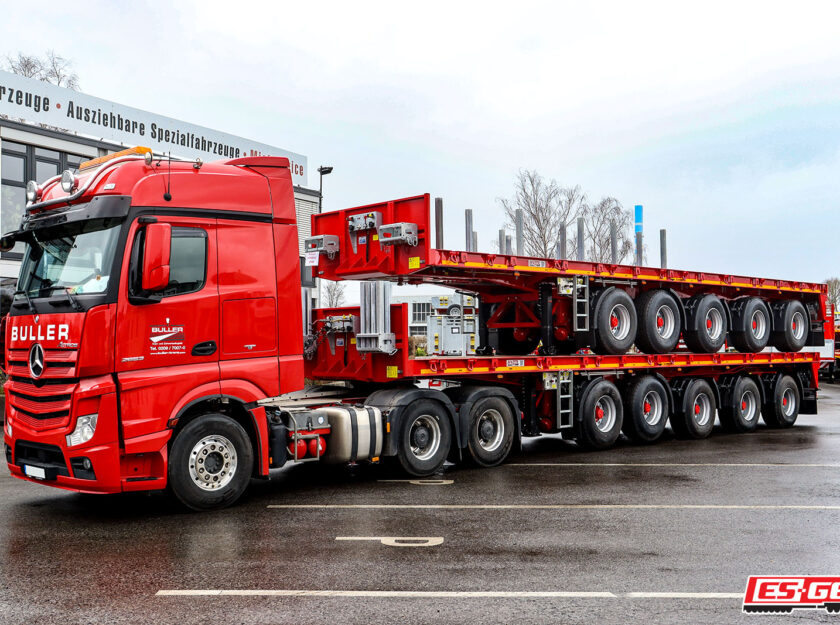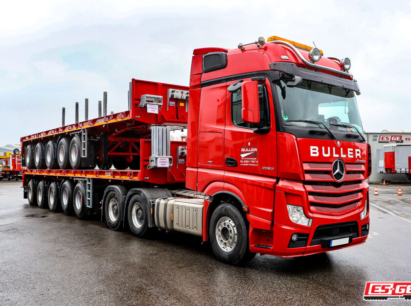 With a tradition that goes back to the 19th century, the Buller family business has continued to develop over the past decades and has opened up new business areas. The Buller company describes itself as a full service provider for crane rental, special transport, vehicle rescue services and industrial installation. The company from the neighboring town of Gelsenkirchen has been using our rental service for many years, but also regularly buys individually configured vehicles. In the summer of last year, we already focused on our long-standing customer as part of the delivery of a low-loader semi-trailer from MAX Trailer. At the beginning of the year, two new ES-GE ballast semi-trailers were ready for the takeover by Josef Buller GmbH.