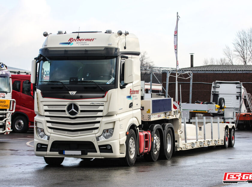 The modern vehicle fleet comprises a total of 120 trucks or truck tractors, which – depending on the vehicle type and requirement – are combined with 160 trailers or semitrailers. In addition to the semi-trailers known as “standard vehicles”, the fleet includes building material vehicles, dump trucks, construction machinery as well as heavy-duty transport vehicles. With the handover of a new MegaMAX lowbed trailer from Faymonville, we have added another vehicle to the latter category. The semitrailer, painted in the corporate colour of Rothermel, was ready to be picked up on our premises in Essen.